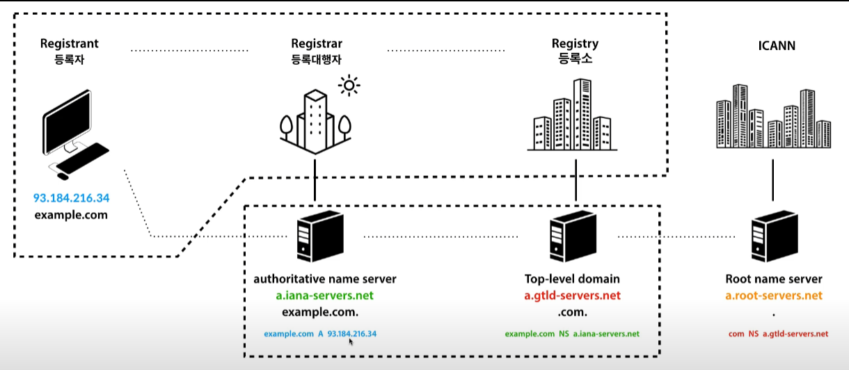 위에서 부터 차례대로. ICANN -> Registry -> Registrar -> Registrant로 이동하며 A 타입으로 저장된 레코드를 통해 IPv4 주소를 얻었다.