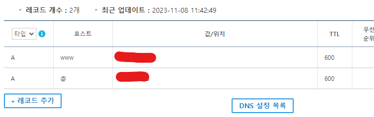 해당 레코드에 A타입으로 IP주소를 등록해줬다.