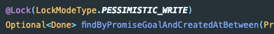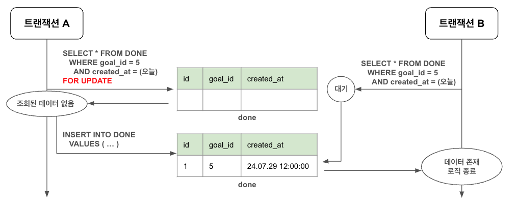 - 오늘 해당목표의 수행기록(DONE)이 있는지 체크하는 쿼리에 비관적 락을 적용하였다.