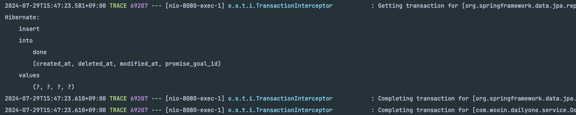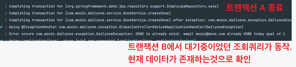 2. 첫번째 요청의 트랜잭션이 진행되어 새로운 done 데이터를 저장하고 트랜잭션이 종료