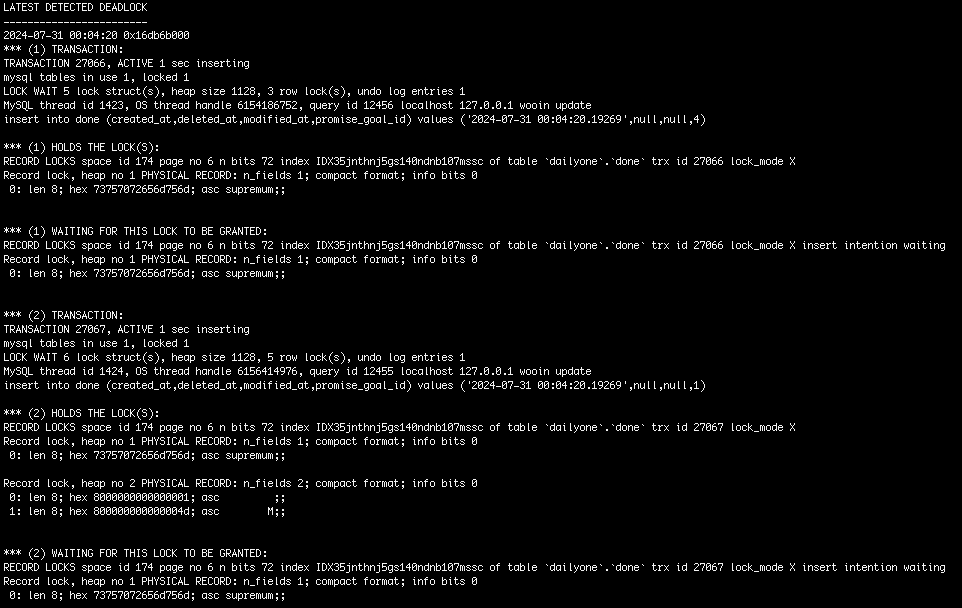 - 하지만, 다른 데이터를 동시에 insert하는 경우 데드락이 발생.