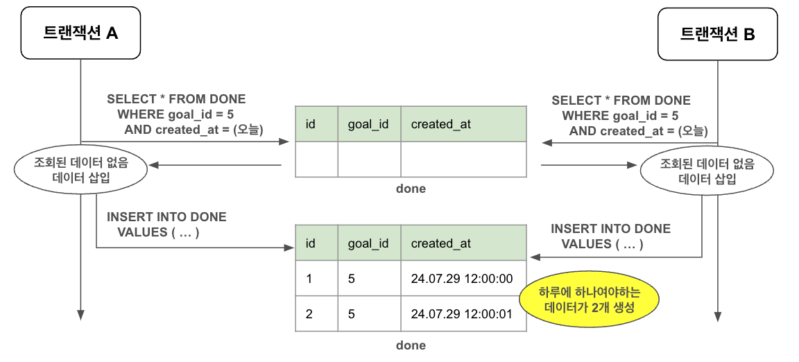 https://thiswooin.tistory.com/147 트러블슈팅 : 목표에 오늘의 DONE기록시 동시성 문제로 인한 중복 생성 (1/2)문제상황동시에 done 테이블에 접근하여 오늘 생성된 데이터가 있는지 조회각 요청 모두 조회
