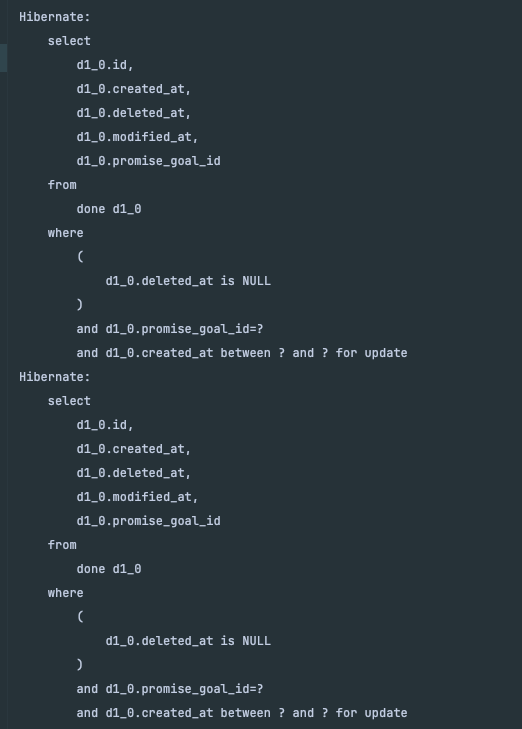 비관적락을 적용한 해당 목표에 오늘 생성된 done이 있는지 조회하는 쿼리.