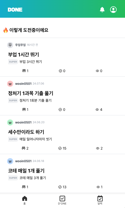 - 각 목표 하단에 참여하는 참가자 수 - 총 달성 수 - 조회 수 를 표기했다.
