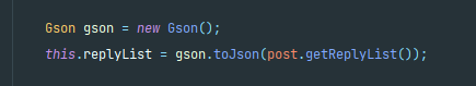 Post에서 받아올 때, PostResponseDto에 댓글을 List<Reply>에서 String으로 바꾸고 해당 List<Reply>를 JSON형태의 String 으로 변환해서 넣어주었다.